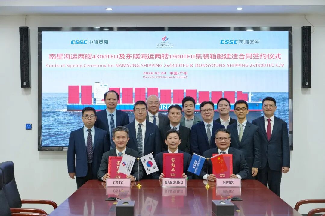 On March 4th, CSSC Huangpu Wenchong Shipbuilding Co., Ltd., a subsidiary of China State Shipbuilding Corporation (CSSC), together with China Shipbuilding Trading Co. Ltd (CSTC), successfully signed contracts with South Korean companies Namsung Shipping and Dongyoung Shipping for the construction of two 4300TEU and two 1900TEU container ships. This signing marks another significant achievement for Huangpu Wenchong in gaining recognition from major East Asian shipowners for its high-quality ship designs and reliable performance, further solidifying its market expansion.