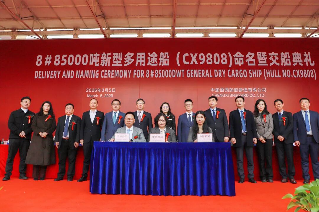 On March 5, China Shipbuilding Industry Corporation’s subsidiary, CSSC Chengxi Shipyard, delivered the 84,500 DWT dry bulk carrier “CSPC SAGITTARIUS” at its Yangzhou facility to CITIC Financial Leasing, which is the seventh new building delivered by CSSC Chengxi Shipyard this year.