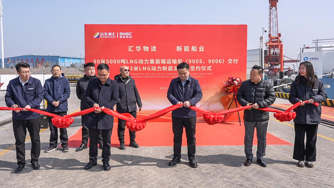 On March 6, a signing ceremony for a 73-meter new energy ship and the delivery ceremony for LNG-powered container ships No. 9005 and No. 9006 were successfully held at Xinneng Shipbuilding. Hao Dengshun, General Manager of Shandong Huihua Logistics Supply Chain Management Co., Ltd., Wu Zecheng, Deputy Secretary of the Party Committee and General Manager of Xinneng Shipbuilding, Wang Ting, Deputy General Manager of Jining Port and Shipping Logistics Co., Ltd., and Liu Peilong, General Manager of Jining Xianglong Crew Service Co., Ltd., attended the event.