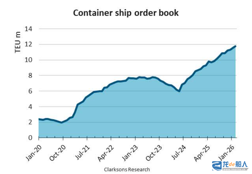 In the first two months of 2026, shipowners placed orders for another 102 container ships, with a total capacity of 665,000 TEU; as of the end of February, the total global container ship order volume reached 11.8 million TEU, a year-on-year increase of 28%.