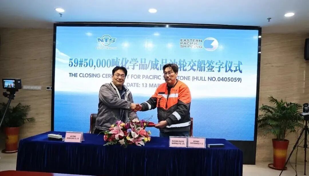 On March 13, New Times Shipbuilding held a signing and delivery ceremony for a 50,000 DWT Type II chemical tanker; the vessel will be officially delivered to the Singaporean shipowner EPS for operation.
