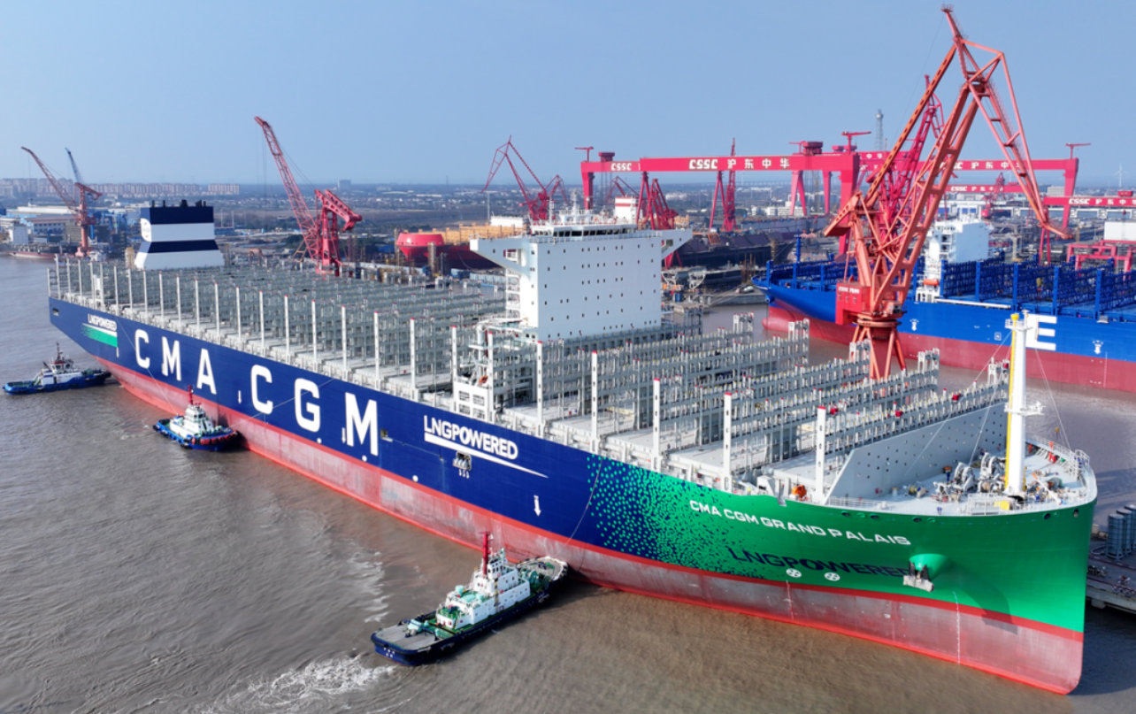 On March 17, Hudong-Zhonghua Shipbuilding (Group) Co., Ltd., a subsidiary of China State Shipbuilding Corporation (CSSC), delivered the “CMA CGM Grand Palais”, the world’s largest 24,000 TEU LNG-fueled dual-fuel container ship, seven and a half months ahead of schedule. This marks the 20th large container ship Hudong-Zhonghua has built for France’s CMA CGM Group, setting a new benchmark for deep cooperation between China and France in the fields of green shipping and high-end manufacturing.