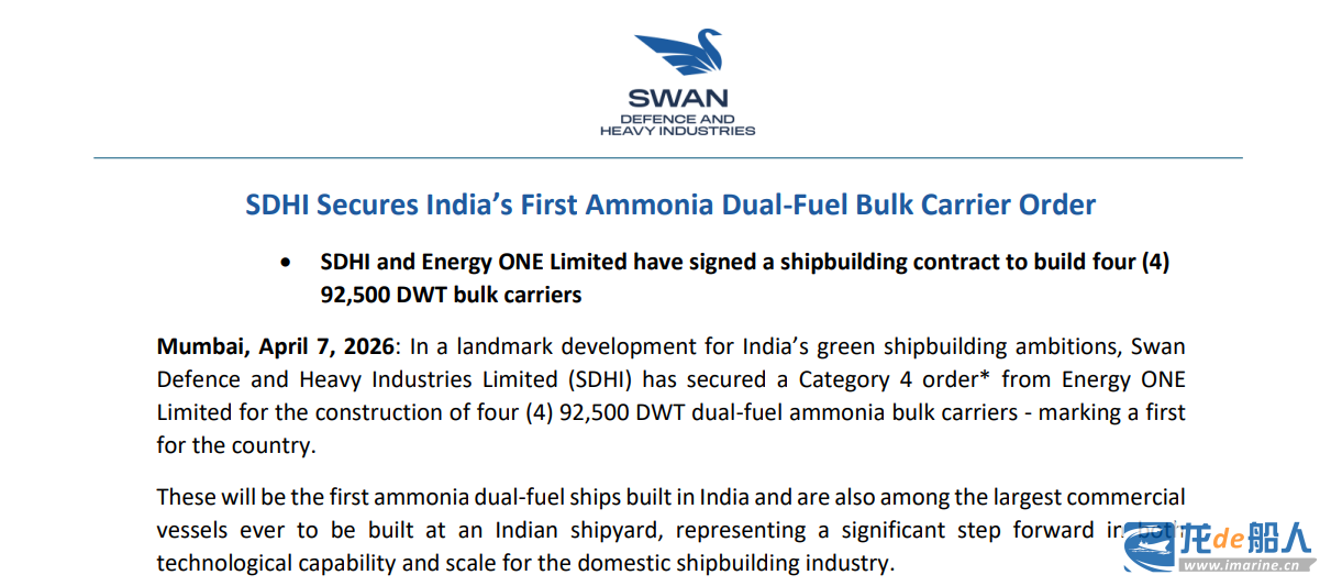 On April 7, SDHI announced on its official website that the shipbuilder had signed a contract with Energy ONE to build four 92,500 DWT ammonia-dual-fuel bulk carriers. The first vessel is expected to be delivered in October 2029, with subsequent vessels to be delivered every four months. The order is valued between 15.01 billion and 30 billion rupees (approximately 160 million to320 million), which translates to a construction cost per vessel ranging from 40 million to80 million.