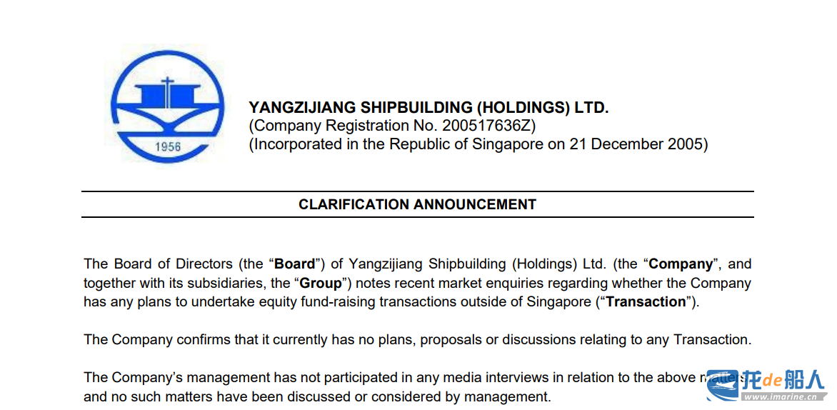 Recently, Yangzijiang Shipbuilding (Holdings) issued a clarification in response to market inquiries regarding whether the company plans to conduct equity financing transactions outside of Singapore.