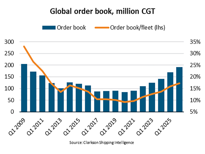 “By the end of the first quarter of 2026, the global shipbuilding order book hit a 17-year high, reaching 191 million compensated gross tonnes (CGT). This is equivalent to 17% of the global fleet, the highest ratio since 2011. The order book has been boosted by higher newbuilding contracting throughout the 2020s and most recently by the highest quarterly crude tanker contracting in history,” says Filipe Gouveia, shipping analysis manager at BIMCO.