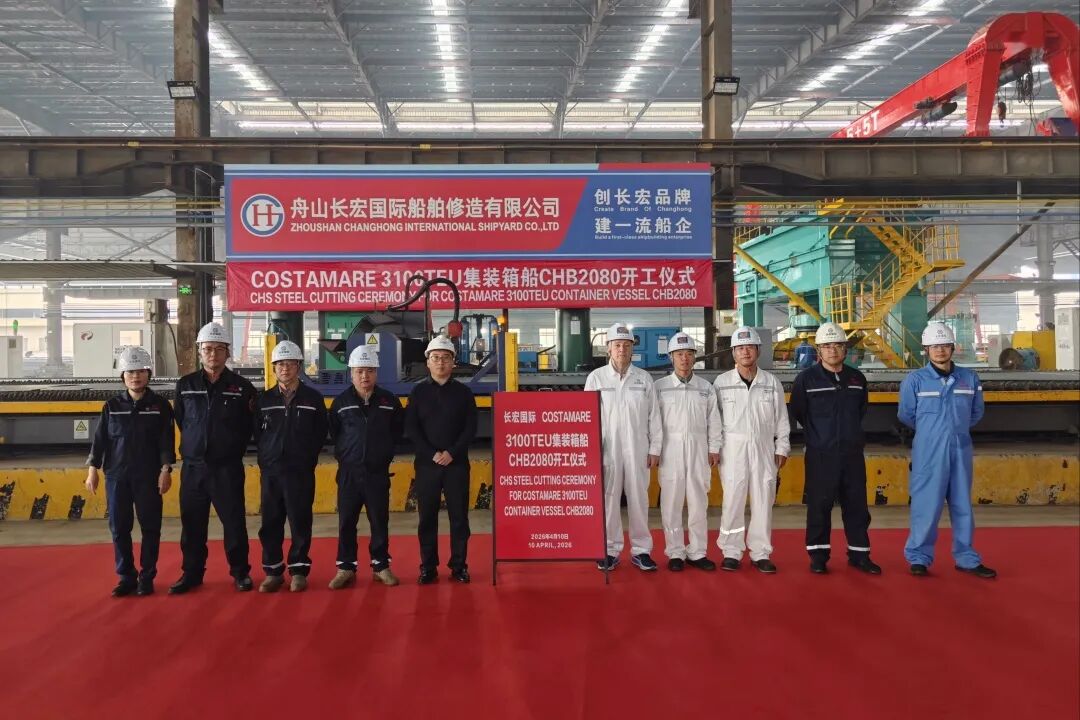 On April 10, Zhoushan Changhong International held a steel-cutting ceremony for the second 3,100-TEU container ship it is building for the Greek shipowner COSTAMARE SHIPPING.