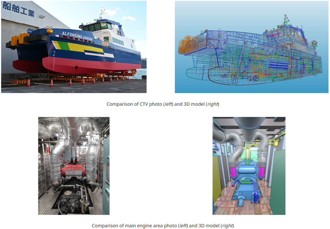 During the construction phase, the vessel was built using the design-stage 3D model. In addition, 3D scanning of the actual structure was conducted during construction to visualize deviations from the design data.