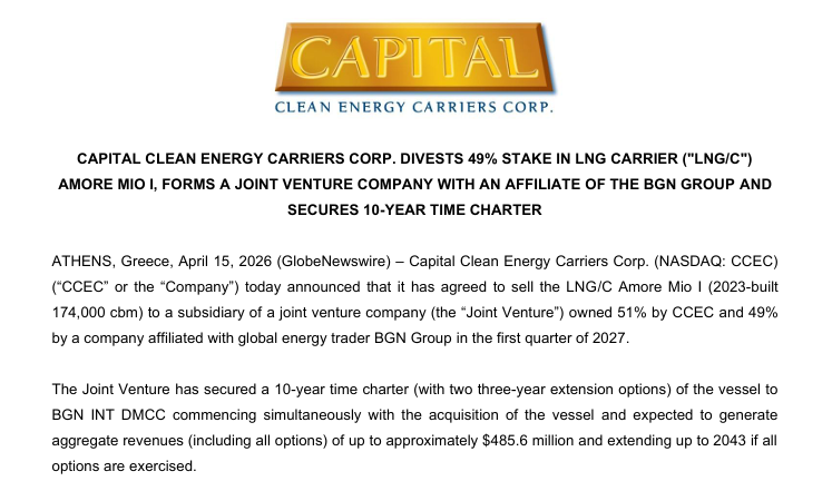 Jerry Kalogiratos, CEO of CCEC, commented: “This innovative transaction enables CCEC to achieve several strategic objectives simultaneously. Firstly, it highlights our ability to attract co-investment with a major energy trading partner. Secondly, securing a new long-term charter underscores the enduring strength of the LNG shipping sector for reputable owners operating state-of-the-art LNG carriers. Thirdly, the new charter enhances the diversity and quality of our charter portfolio, provides further balance sheet flexibility and strengthens cash flow visibility for our investors.”