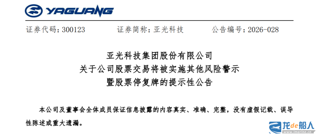 According to the announcement, Yaguang Technology Group’s stock will be suspended from trading for one day starting from the opening of the market on April 20, 2026, and will resume trading on April 21, 2026. After the resumption of trading, other risk warnings will be implemented, and the stock abbreviation will be changed from “Yaguang Technology” to “ST Yaguang”; the stock code will remain unchanged as “300123”; after the implementation of other risk warnings, the daily price fluctuation limit of the company’s stock will remain at 20%.