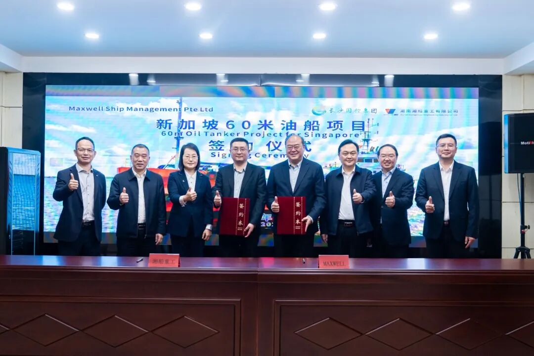 In the conference room at Xiangchuan Heavy Industry, Chen Yifu, the founder and controlling shareholder of Maxwell Ship Management Pte Ltd, and Qiu Jun, Party Secretary and Director of Xiangship Heavy Industry, formally signed a contract for the construction of two 60-meter oil tankers.