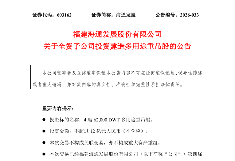 On April 22, Fujian Highton Development Co., Ltd. (hereinafter referred to as “Highton Development”) issued an announcement stating that its wholly-owned subsidiary, Haitong International Shipping Co., Ltd., signed a shipbuilding contract with Taizhou Kouan Shipbuilding to construct four 62,000 DWT multi-purpose heavy-lift vessels.
