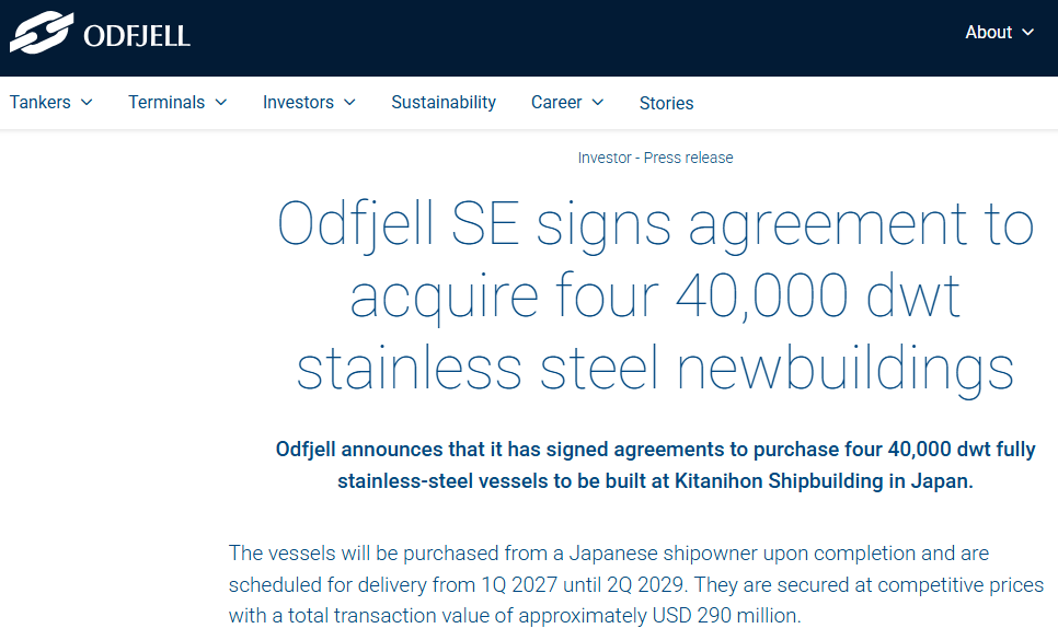 On April 22, Norwegian chemical tanker owner/operator Odfjell announced on its official website that it has signed agreements to purchase four 40,000 dwt fully stainless-steel vessels to be built at Kitanihon Shipbuilding in Japan.