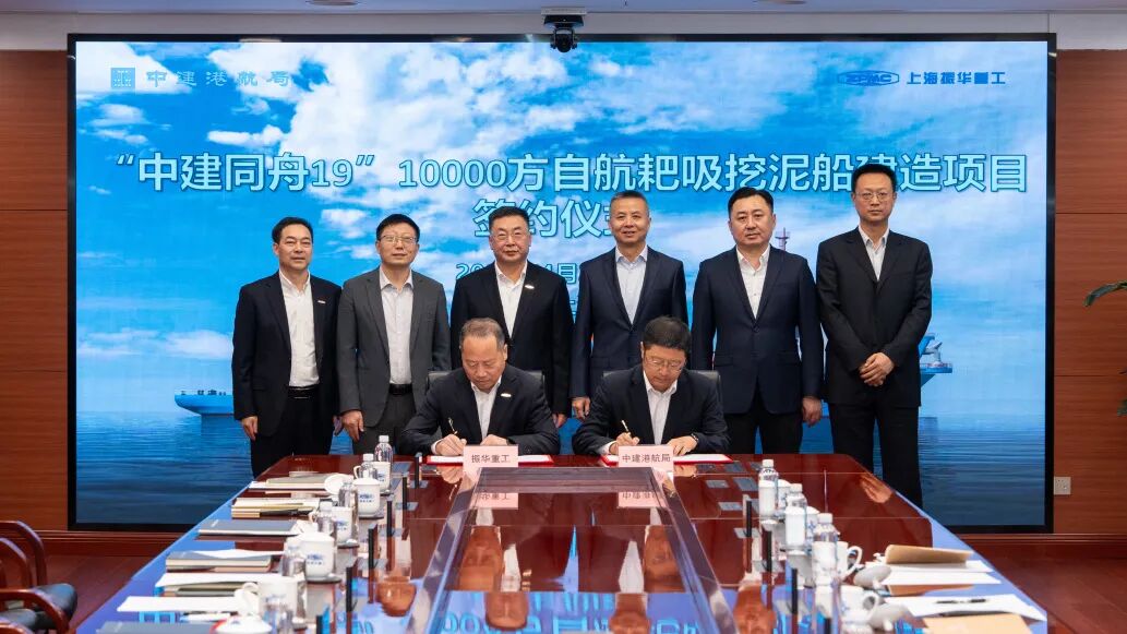 On April 25, Shanghai Zhenhua Port Machinery (ZPMC) and China State Construction Harbour Construction Co., Ltd. (CSCHCC) held a signing ceremony for the “Zhongjian Tongzhou 19,” a 10,000 m³ self-propelled trailing suction hopper dredger.