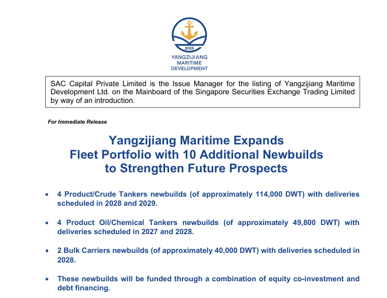 On April 27, Yangzijiang Maritime Development Ltd. (“Yangzijiang Maritime” or the “Company”, and together with its subsidiaries, the “Group”), a one-stop maritime financial solutions provider, announced that the Group has recently signed contracts for an aggregate of 10 newbuilds to be constructed by independent third-party Chinese shipyards with deliveries scheduled from 2027 to 2029.